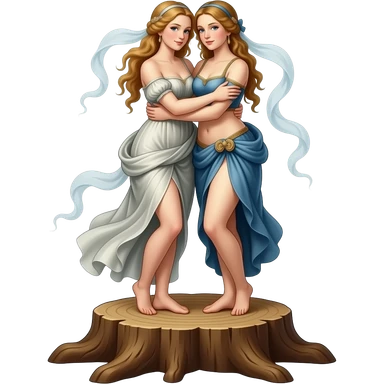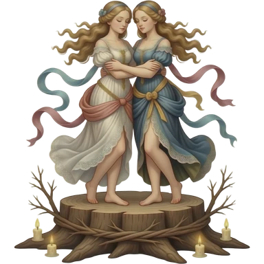 steampunk surreal - The ethereal, seductive Venuses of Lucas Cranach and Sandro Botticelli stand on a large stump, wrapped in twigs, embracing each other. emoji