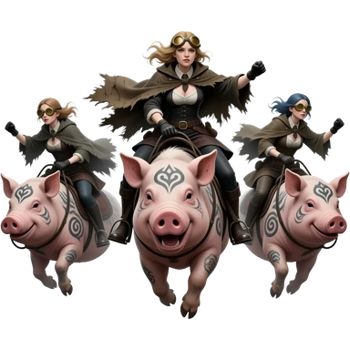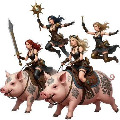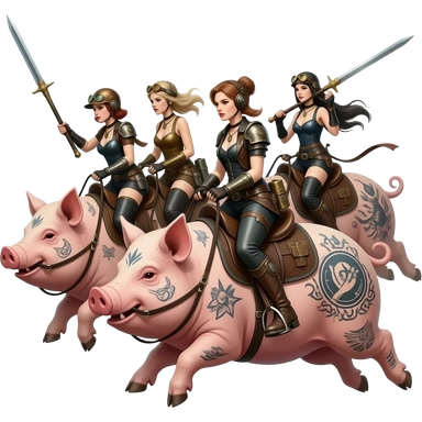 steampunk - four thin and pale female riders of the apocalypse ride leaping on large tattooed pigs in a messy composition emoji