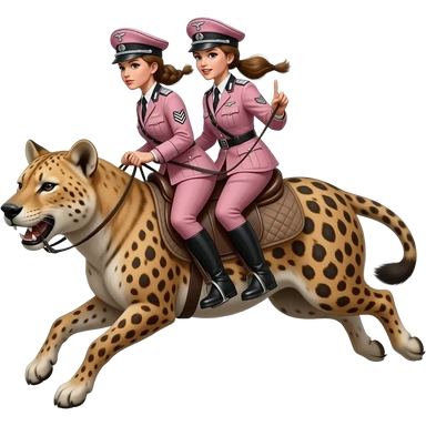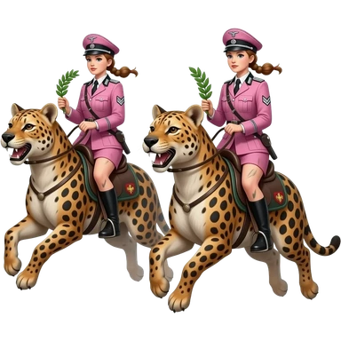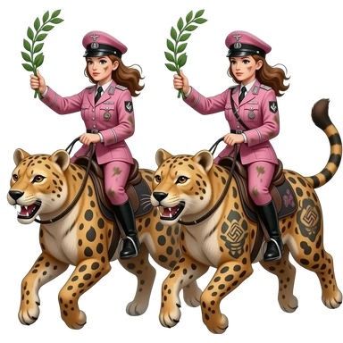steampunk - two skinny and dirty female riders in pink German army uniforms from World War II ride in jumps on large tattooed hyenas with laurel branches in their hands emoji