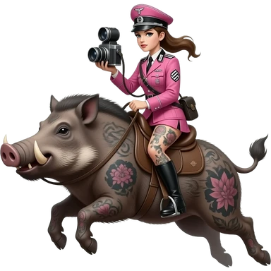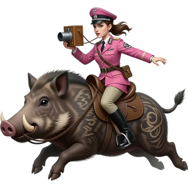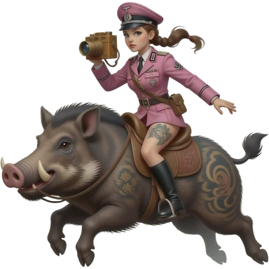 steampunk - creepy female rider in pink WWII German army uniform jumping on a large tattooed boar with a wooden daguerreotype camera emoji