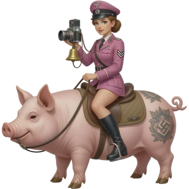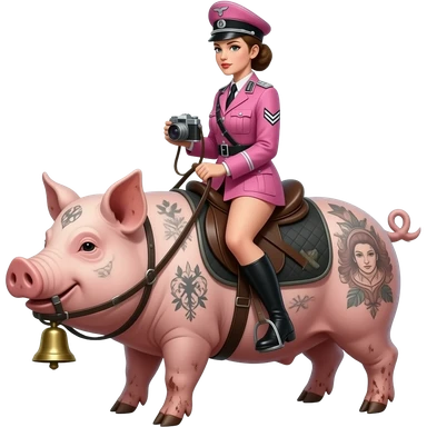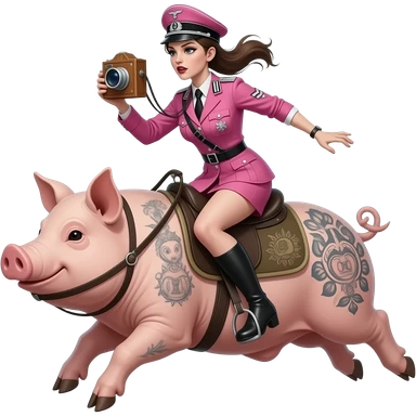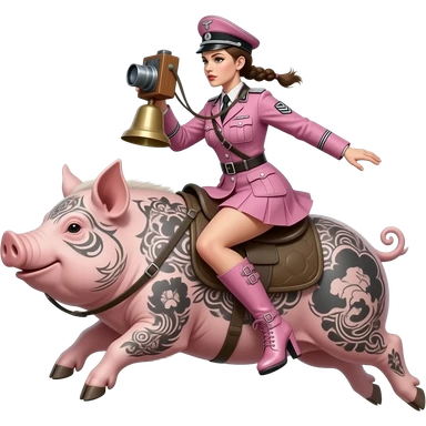 steampunk style - A thin and seductive female rider in a pink German army uniform from World War II rides a large tattooed pig with an antique bellows camera and bare, dirty feet. emoji