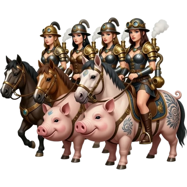 steampunk - four thin and pale female horsemen of the apocalypse ride on large tattooed pigs emoji
