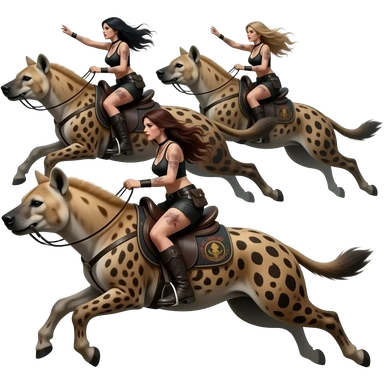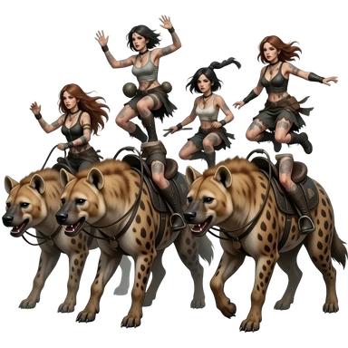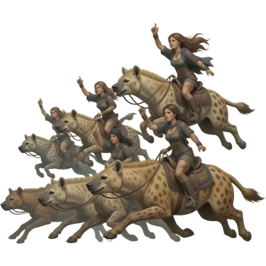steampunk - four skinny and dirty female riders of the apocalypse ride leaping on large tattooed hyenas in a messy composition emoji