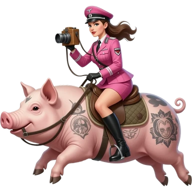 steampunk - A thin and creepy female rider in a pink German WWII uniform jumps on a large tattooed pig with a wooden daguerreotype camera and pink high heels on her feet. emoji