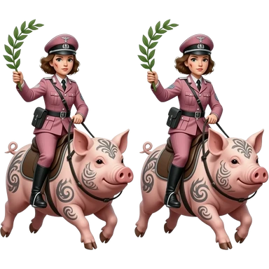 steampunk - two skinny and dirty female riders in pink German army uniforms from World War II ride jumping on large tattooed pigs with laurel branches in their hands emoji
