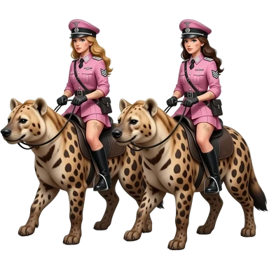 steampunk - Two skinny and dirty female riders in pink German Army uniforms from World War II ride jumping on large tattooed hyenas in a messy composition. emoji