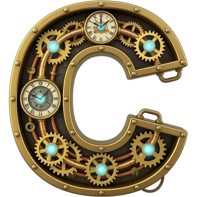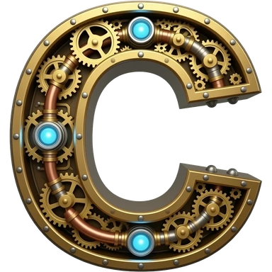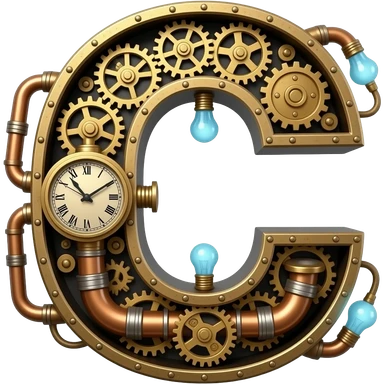 A complex Steampunk Letter 'C' constructed from interlocking brass gears, copper pipes, and tiny hissing steam vents. Small glowing blue Edison bulbs attached to the frame, mechanical clockwork style, highly detailed textures emoji