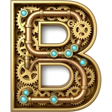A complex Steampunk Letter 'B' constructed from interlocking brass gears, copper pipes, and tiny hissing steam vents. Small glowing blue Edison bulbs attached to the frame, mechanical clockwork style, highly detailed textures emoji