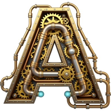 A complex Steampunk Letter 'A' constructed from interlocking brass gears, copper pipes, and tiny hissing steam vents. Small glowing blue Edison bulbs attached to the frame, mechanical clockwork style, highly detailed textures emoji