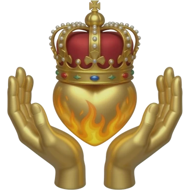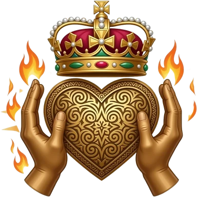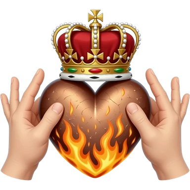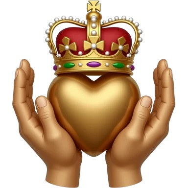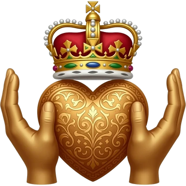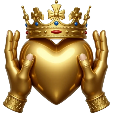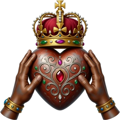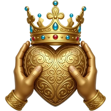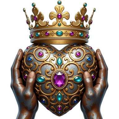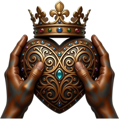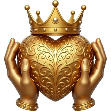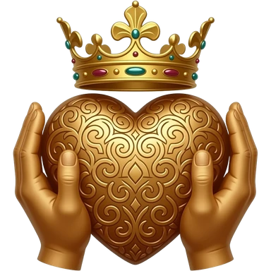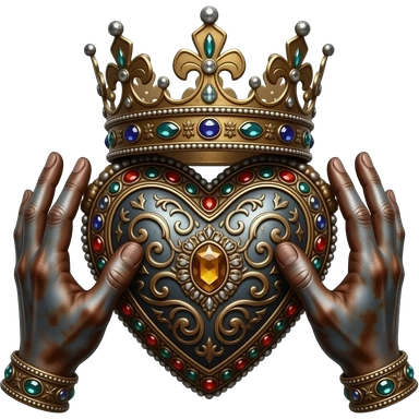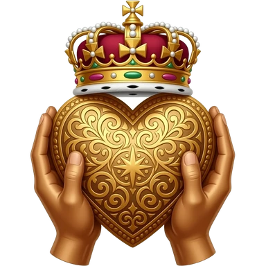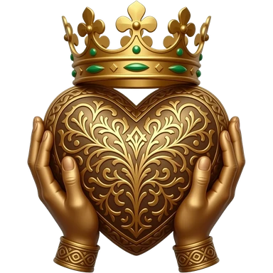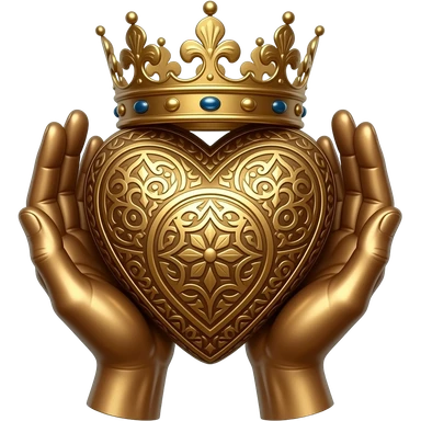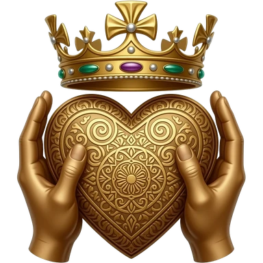 two bronze palms holding with their fingertips a bronze heart richly ornamented with arabesques and a richly decorated royal crown emoji