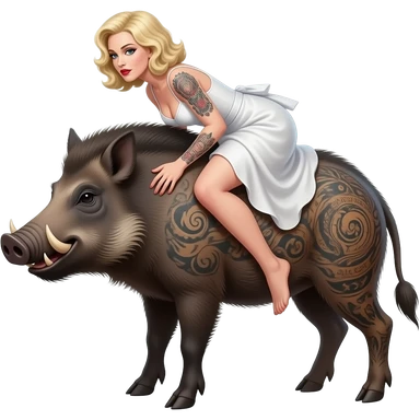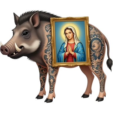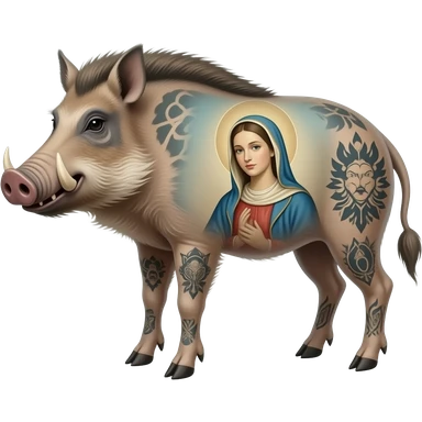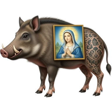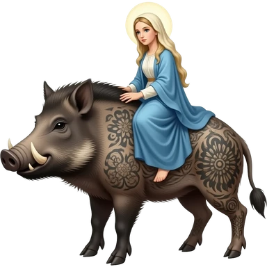 cinematic surrealistic - an armored, tattooed boar carries Botticelli's ethereal Venus on its back emoji