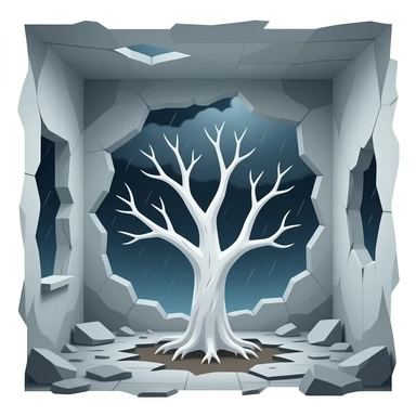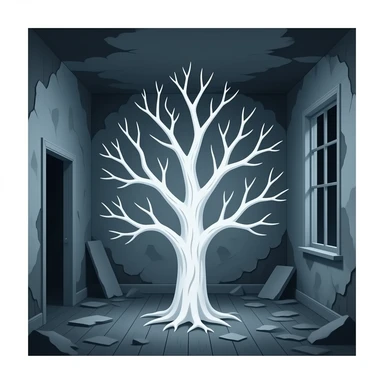 surrealistic - white bare haunted tree grows from a dilapidated room. emoji