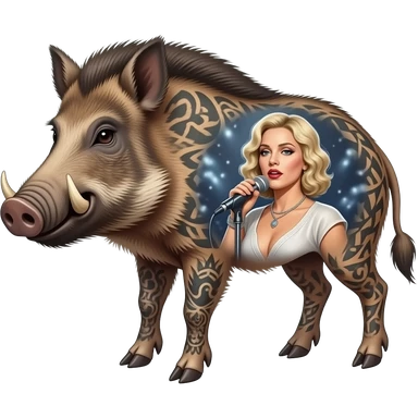 cinematic surrealistic - a tattooed boar with very thin long legs from a painting by Salvador Dali carries the ethereal artist Madonna on its back emoji