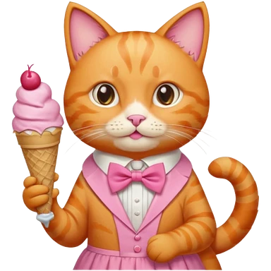 گربه ای نارنجی که لباس و پاپیون صورتی تنشه و پاپیون صورتی رو سرشه بستنی دستشه emoji
