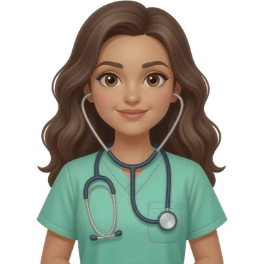 Water colour style image of a full view girl. She has long brown wavy hair, she is tanned with brown eyes and thick eyebrows. The girl is wearing light green scrubs and holding a stethoscope emoji