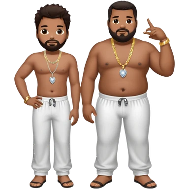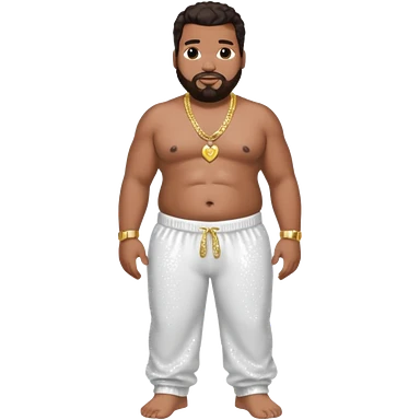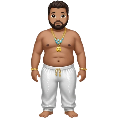 Fatman Scoop with dark brown hair, white sequin baggy pants, shirtless with necklace emoji