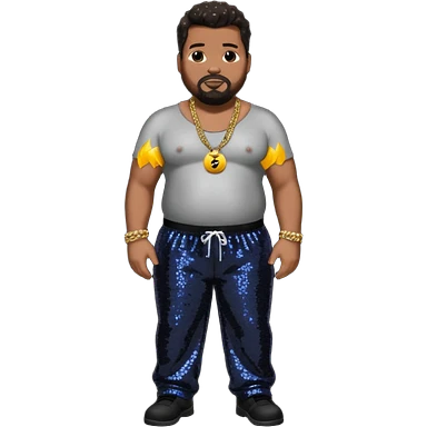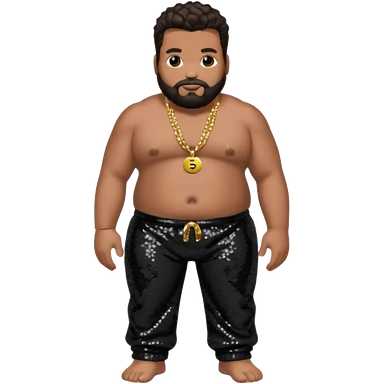 Fatman Scoop with dark brown hair, black sequin baggy pants, shirtless with necklace emoji