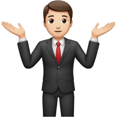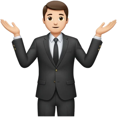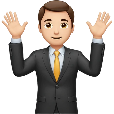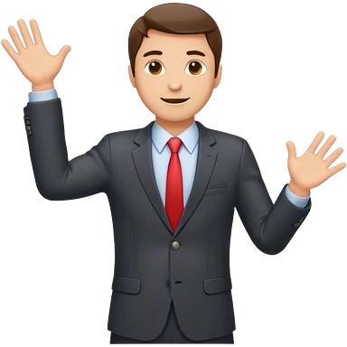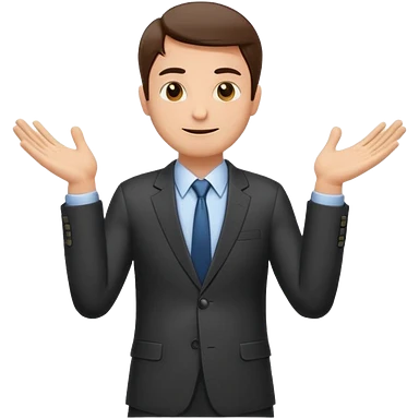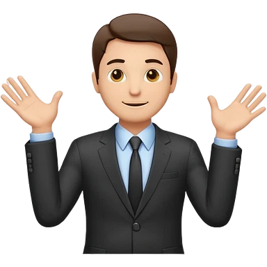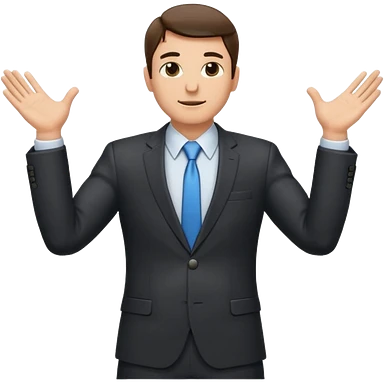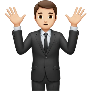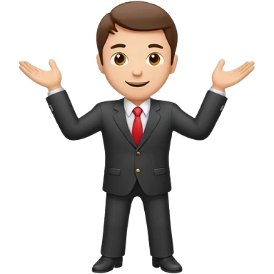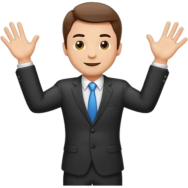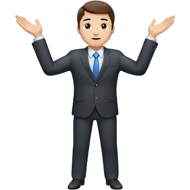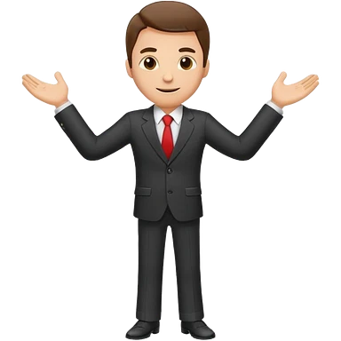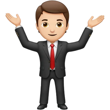 Sticker of a man in a business suit, front view, arms extended forward, friendly expression, clean cartoon style, bold outlines, minimal background, emoji sticker style emoji