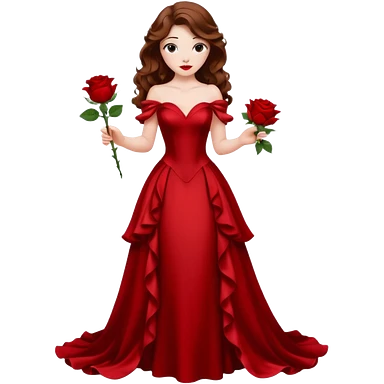 Still life render masterpiece, realistic appearance of Belle the Disney princess, from beauty and the beast, glamorous red silk gown. Holding a single highly realistic, red rose. Brown wavy hair, pale skin, red lips, looking at her prince beside her. emoji