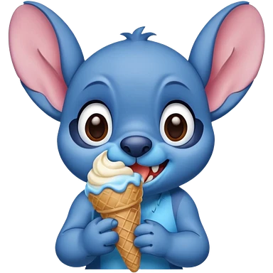 Stitch the blue alien from Lilo & Stitch eating ice cream with a big smile emoji