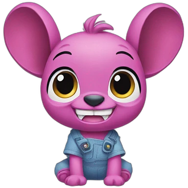 Emoji style: A cute pink alien girl (Angel from Lilo & Stitch) kisses a blue alien boy (Stitch) on the cheek. Stitch looks surprised and his eyes turn into pink hearts. Angel is smiling with eyes closed. 3D emoji style emoji