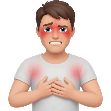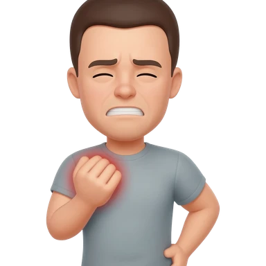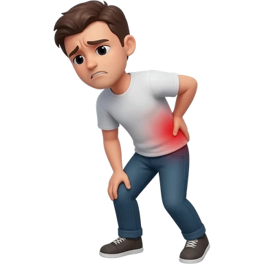 A person wearing casual clothes, holding their stomach with one hand, showing visible discomfort. A red glow appears over the abdominal area to indicate pain. Realistic medical illustration style, clean white background, focus on body language expressing stomach ache or cramps. emoji