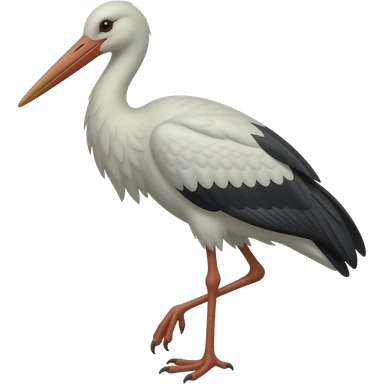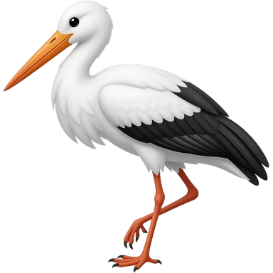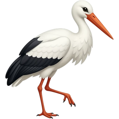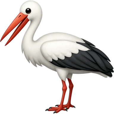 white stork with long legs and a long beak flying in the sky and carrying a blue bundle of cloth in its beak that has a cute baby face peeking out from it emoji
