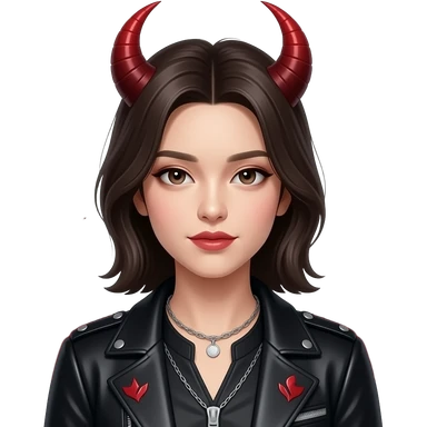 woman Demon cartoon emoji character, head and shoulders included (chest-up crop), centered face, confident and edgy expression, sharp eyes, subtle smirk, small curved horns, clean stylized face, not cute, not scary, modern emoji-style illustration, bold colors, smooth shading, high readability emoji