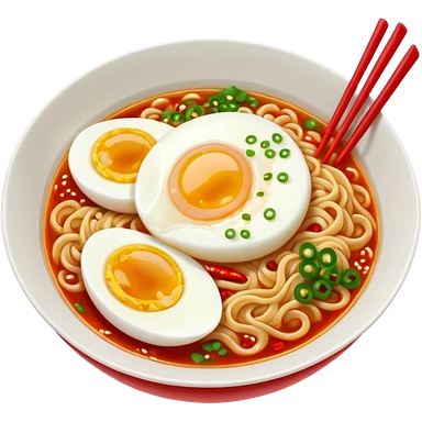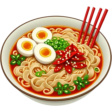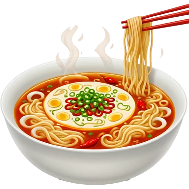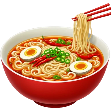 steaming ramen bowl with red broth and chili slices emoji