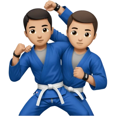 An Asian guy doing Brazilian jiu jitsu with another guy submitting him with an arm bar. The Asian guys wears a blue belt emoji
