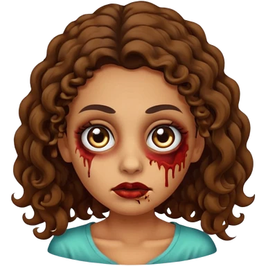 Create a zombie emoji inspired by a young woman with tanned skin, an oval face, large dark eyes, defined eyebrows, a small nose, and medium lips. Her hair should be long, curly, and brown. emoji