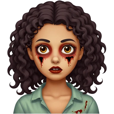 Create a zombie emoji inspired by a young woman with tanned skin, an oval face, large dark eyes, defined eyebrows, a small nose, and medium lips. Her hair should be long, curly, and dark. emoji