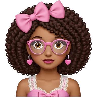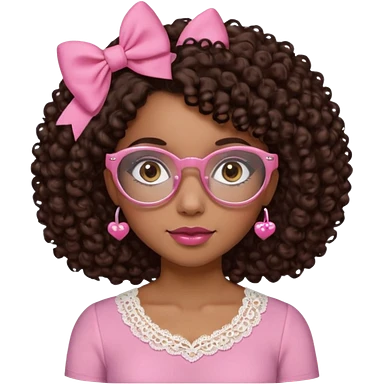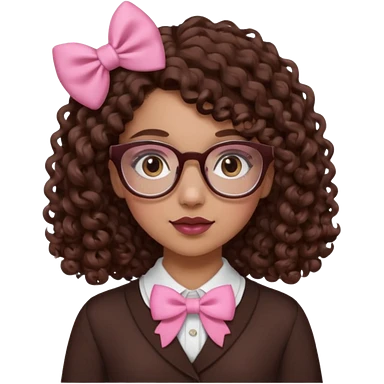 medium-lightskin girl with medium length chocolate brown side part curly hair, pink and white bow on the side, with brown glasses, brown eyes, noes piercing emoji