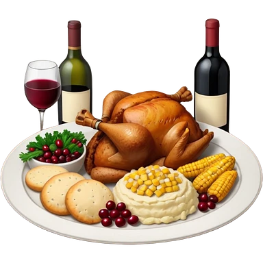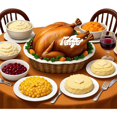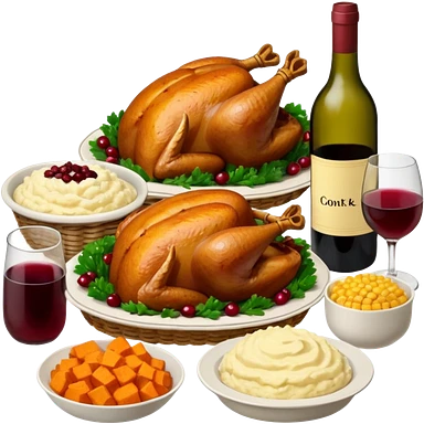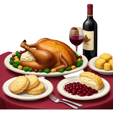 Thanksgiving Dinner with friends of all different races; have the food be a cooked turkey, mashed potatoes, corn, a basket of biscuits, a small bowl of cranberry sauce, baked yams, steamed vegetables, and a bottle of wine. emoji
