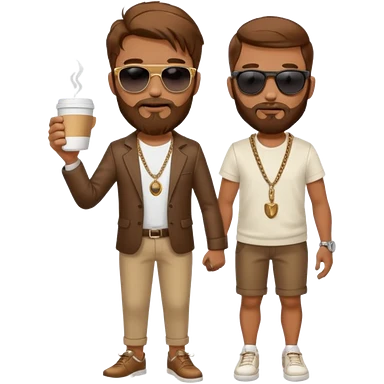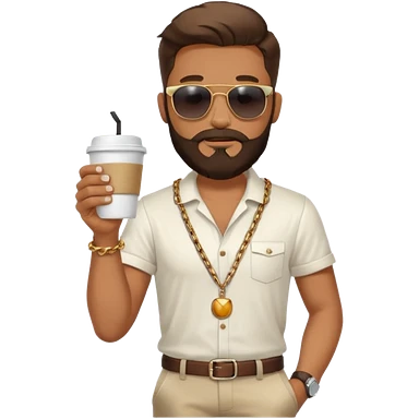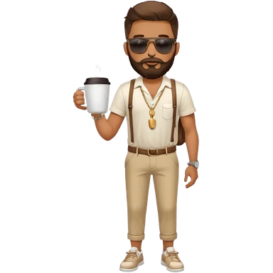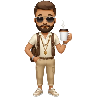 stylish bearded male traveler with coffee cup on hand, cool sun glasses with chain strap, white shoes, emoji