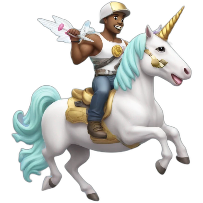 Strong man, machine gun, flying on a unicorn eating ice cream with a unicorn hat on emoji | AI Emoji Generator