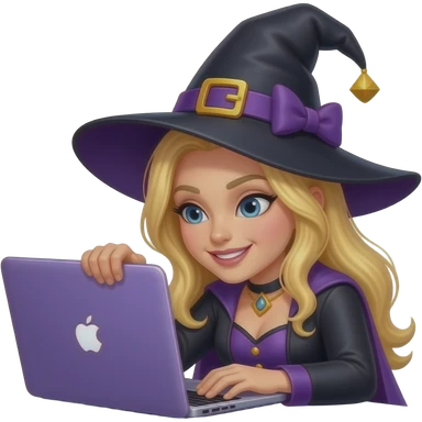 blonde witch with head on purple apple macbook keyboard, purple and black outfit emoji