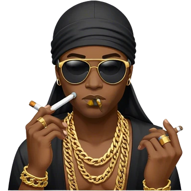 make me an image of a black emoji and he is wearing a durag smoking a cigarette with a massive gold chain on that says BIG N and he is wearing black sunglasses emoji