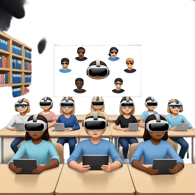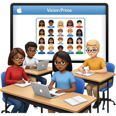 Birdseye view of large study space with students working separately add students wearing Vision Pro headsets emoji