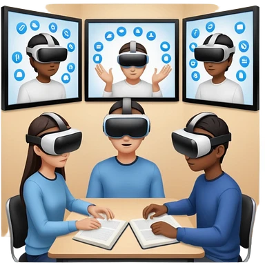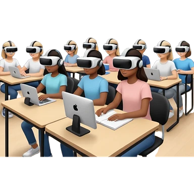 Birdseye view of large study space with students working separately add students wearing Virtual reality headsets emoji