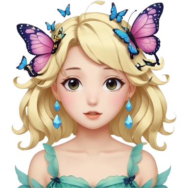 gorgeous shiny blushing anime lady with butterflies and beautiful hair fairycore high quality detailed vogue trending aesthetic emoji