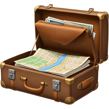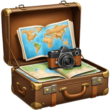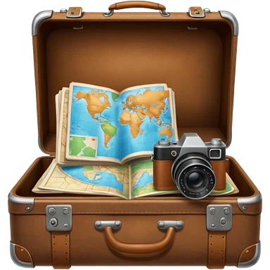An open traveler's suitcase, from which a map, camera, and phrasebook peek out. emoji