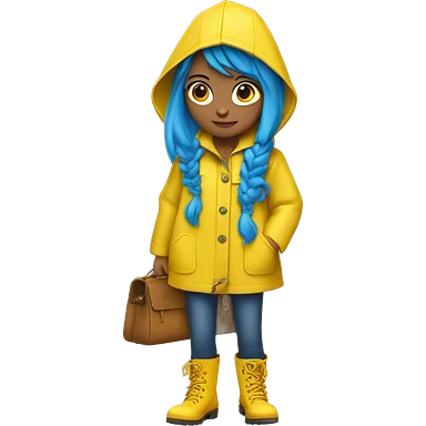 girl with blue hair in a bob, button eyes, a yellow raincoat, some freckles, blue skinny jeans, a yellow pair of rain boots to match the rain coat, a bag like purse, and a scowl emoji