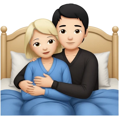 Sexy large breasted elderly asian woman in a low cut top and with black hair hugs her blonde haired boy in bed emoji