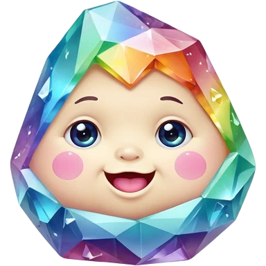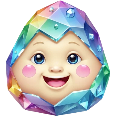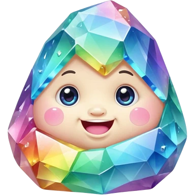 A single pastel rainbow crystal baby rock character, chubby and heavy with a chunky, irregular polygon shape,covered in faceted crystal planes and small chips, big glossy rainbow eyes and a small smiling mout emoji