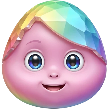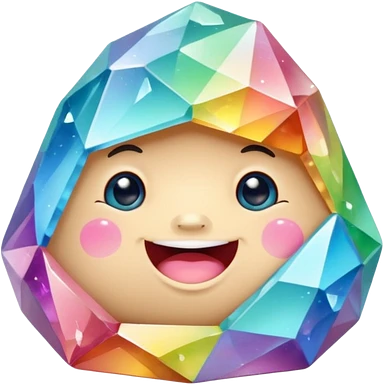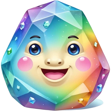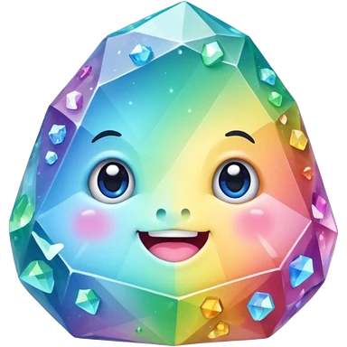 A single pastel rainbow crystal rock character, chubby and heavy with a chunky, irregular polygon shape,covered in faceted crystal planes and small chips, big glossy rainbow eyes and a small smiling mout emoji