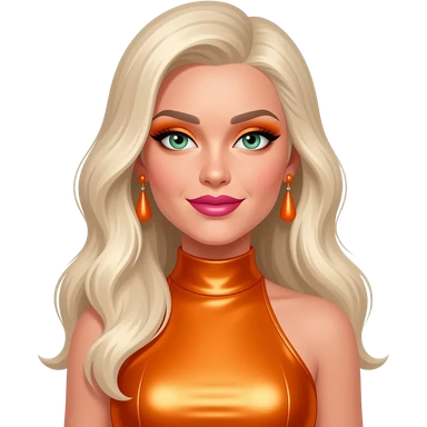 Miranda from Diva Starz with green eyes, long platinum blonde hair, orange eyeshadow, hot pink lipstick, orange metallic high neck dress, orange earrings emoji