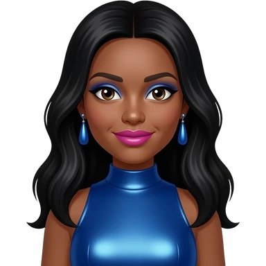 Tia from Diva Starz with dark skin, dark brown eyes, long black hair, blue eyeshadow, hot pink lipstick, blue metallic high neck dress, blue earrings emoji