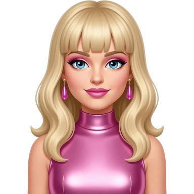 Alexa from Diva Starz with blue eyes, long blonde bang hair, pink eyeshadow and lipstick, pink metallic high neck dress, pink earrings emoji