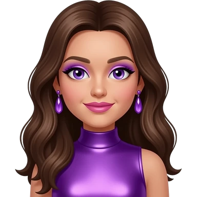 Nikki from Diva Starz with violet eyes, long brown hair, lilac eyeshadow, pink lipstick, purple metallic high neck dress, lilac earrings emoji